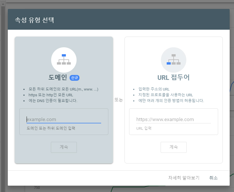 DNS 레코드를 통해 도메인 소유권을 확인하려면 위의 그림에서 URL 접두어 도메인 방식을 선택하여 진행하도록 합니다. '도메인 또는 하위 도메인 입력' 필드에 도메인을 입력하고 계속을 클릭합니다.