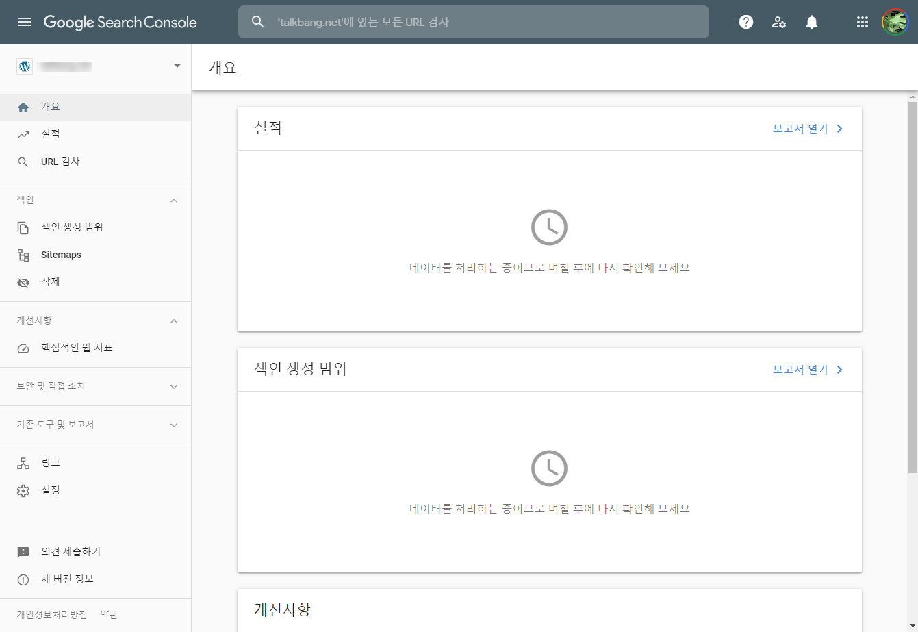 아직 수집한 데이터가 없기 때문에 아무런 정보가 표시되지 않습니다. 사이트맵을 제출하고 며칠 기다리면 데이터가 수집되기 시작합니다.