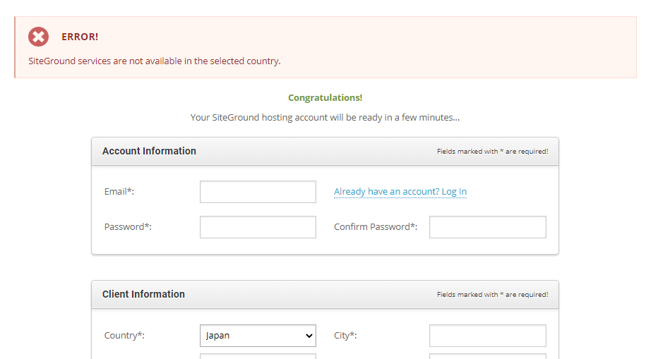 이제 한국을 비롯하여 일본, 말레이시아, 대만 등 대부분의 아시아 국가에서 해외 웹호스팅 중 하나인 사이트그라운드 (SiteGround) 서비스를 이용할 수 없게 되었습니다. 사이트그라운드 가입 시 국가를 '대한민국' (South Korea)으로 설정하면 'SiteGround services are not available in the selected country.'가 표시되면서 서비스 가입이 불가능합니다.