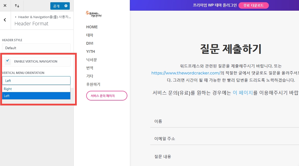 Divi 테마에서 헤더 위치 변경하기 [수직 내비게이션]