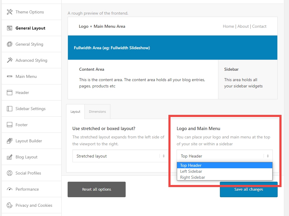 예를 들어, Enfold 테마의 경우 Enfold > General Layhout의 Logo and Main Menu 섹션에서 헤더 위치를 Top Header, Left Sidebar, Right Sidebar 위치 중에서 선택할 수 있습니다.
