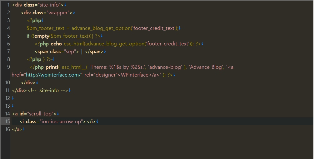 첫 번째는 푸터 위젯 영역과 관련되어 있고, 푸터 Copyright 텍스트는 두 번째 코드와 관련되어 있습니다. /wp-content/themes/advance-blog/components/footer/ 폴더로 이동하여 site-info.php 파일을 열도록 합니다.