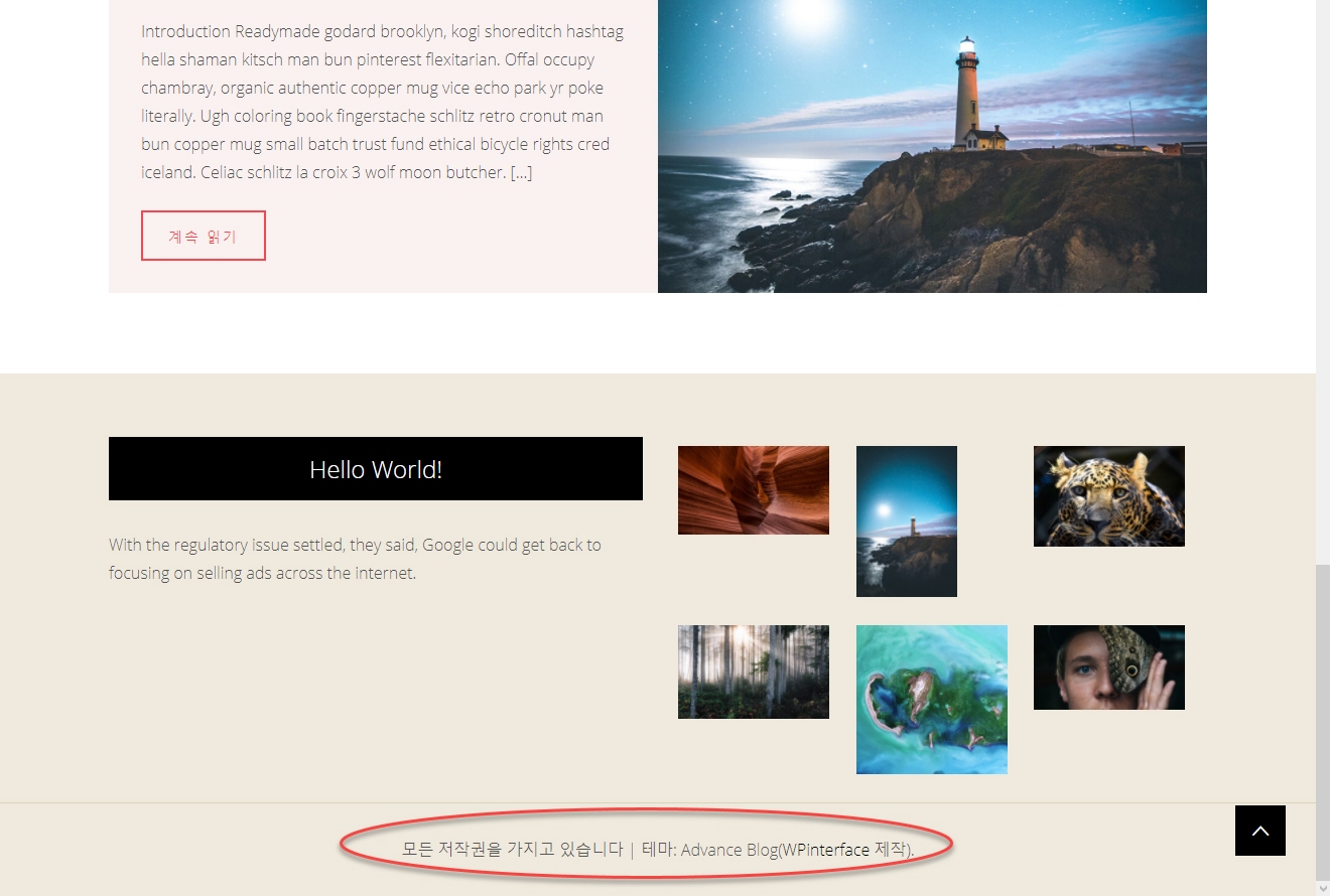 "모든 저작권을 가지고 있습니다" 부분은 워드프레스 관리자 페이지 > 테마 디자인 > 사용자 정의하기 > Advance Blog 옵션 > 바닥글 제작정보 설정에서 변경이 가능합니다.