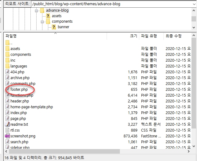 - footer.php 파일을 차일드 테마 폴더(예: wp-content/themes/advance-blog-child/)로 업로드합니다.