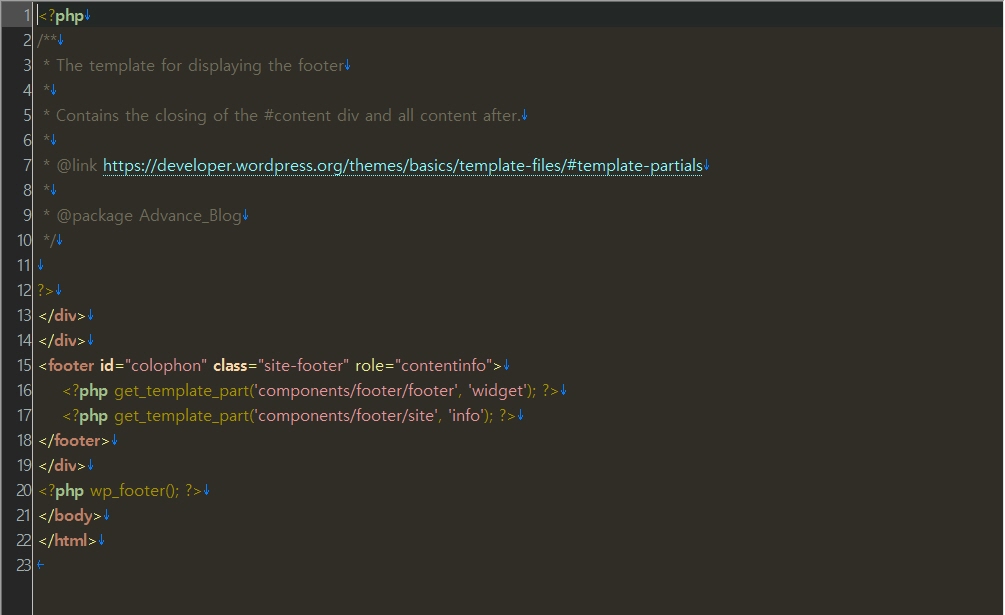 - footer.php 파일을 열고 <?php get_template_part('components/footer/site', 'info'); ?> 부분을 적절히 변경합니다.