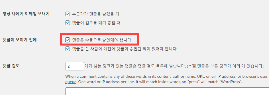 그리고 악성 댓글이나 스팸 댓글이 달릴 때 댓글이 사이트에 표시되지 않도록 새로운 댓글이 달릴 때 관리자가 승인해야 사이트에 표시되도록 하려면 댓글이 보이기 전에 옵션의 '댓글은 수동으로 승인돼야 합니다'를 체크하면 됩니다.
