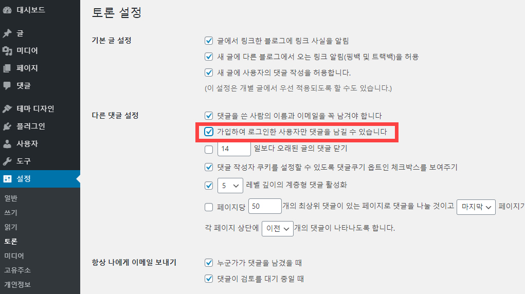 회원(로그인 사용자)만 댓글을 달 수 있도록 설정하려면 워드프레스 관리자 페이지 > 설정 > 토론으로 이동하여 다른 댓글 설정의 '가입하여 로그인한 사용자만 댓글을 남길 수 있습니다'를 체크하면 됩니다.