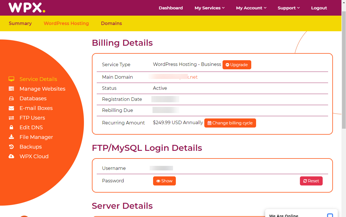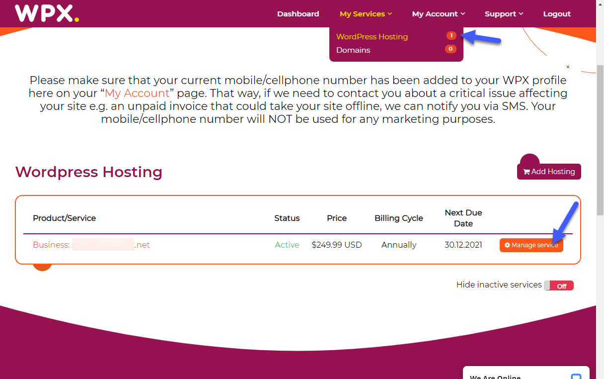 WPX 서비스를 이용한다면 My Services > WordPress Hosting을 클릭하여 로그인하면 사용 중인 워드프레스 호스팅 상품이 표시됩니다. Manage service를 클릭하면 서비스를 관리할 수 있는 대시보드로 이동합니다.