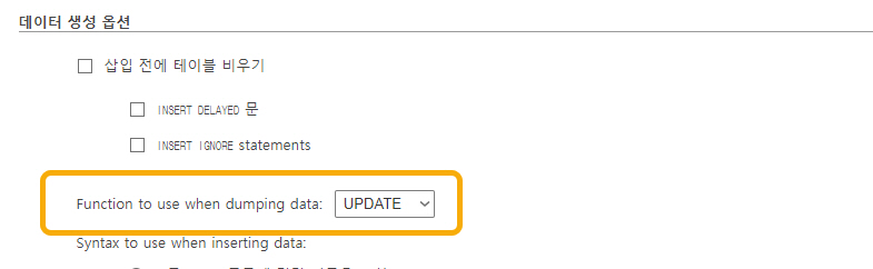 그리고 '데이터 생성 옵션' 아래의 'Function to use when dumping data'를 INSERT 대신 UPDATE를 선택하여 내보내기합니다.