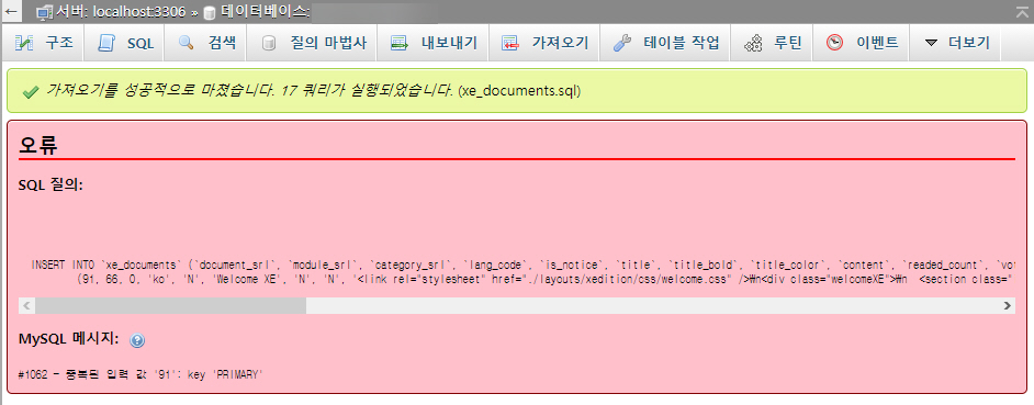 phpMyAdmin 임포트 오류: '#1062 - 중복된 입력 값'