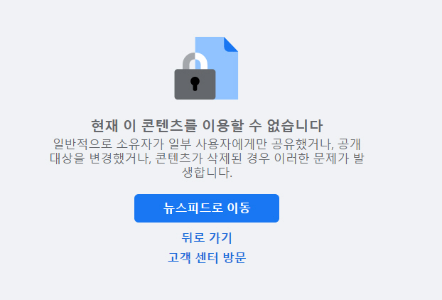 페이스북 계정이 비활성화될 경우 방문자들이 해당 계정 페이지를 방문하면 "현재 이 콘텐츠를 이용할 수 없습니다" 화면이 표시됩니다.