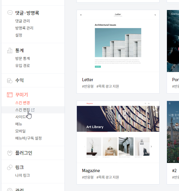 글자 크기를 조정하려면 꾸미기 > 스킨 편집을 클릭합니다.