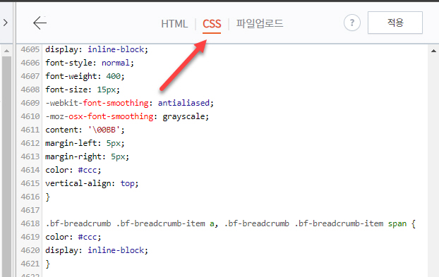 참고로 CSS 탭의 맨 아래에 코드를 추가해도 되지만, CSS 탭에서 해당 코드 부분을 찾아서 수정하는 것도 가능합니다. 하지만 그럴 경우 추후에 어느 부분의 코드가 수정되었는지 파악하기 쉽지 않을 수 있습니다. 그러므로 저는 가급적 원래 CSS 코드를 수정하기보다는 맨 아래에 수정되거나 부가되는 CSS 코드를 추가하는 방식을 선호합니다.