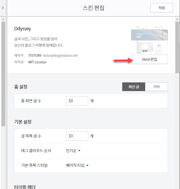 스킨 편집 페이지가 표시되면 html 편집 버튼을 누릅니다.
