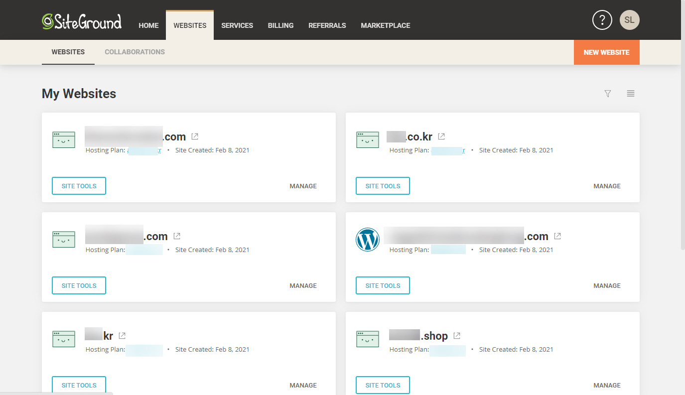 사이트그라운드에 로그인한 후에 Websites 메뉴를 클릭하면 그림과 같이 연결된 각 도메인 목록이 표시되고, 각 도메인에 다하여 Site Tools 버튼이 표시됩니다.