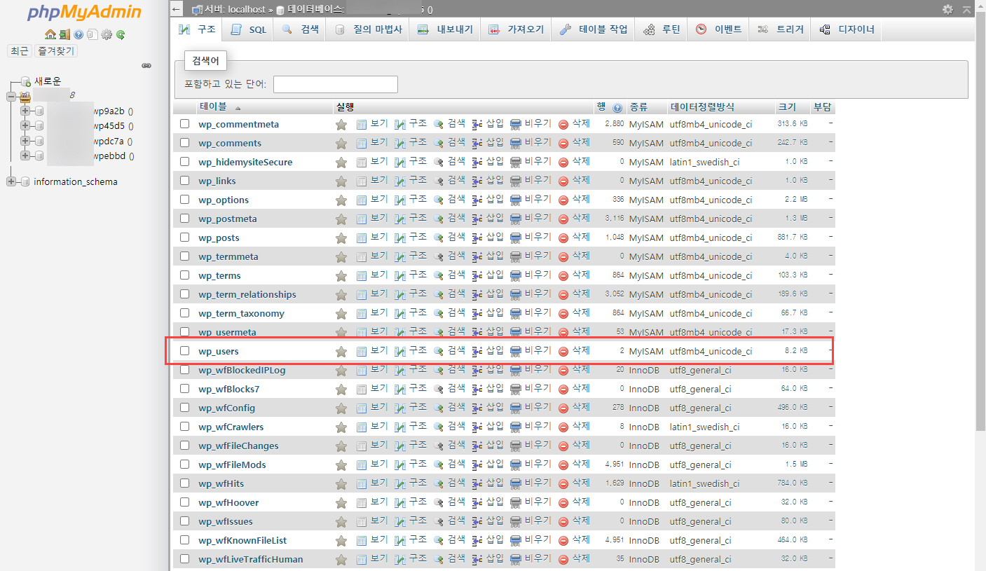 phpMyAdmin에 접속하면 wp_users 테이블을 클릭합니다.