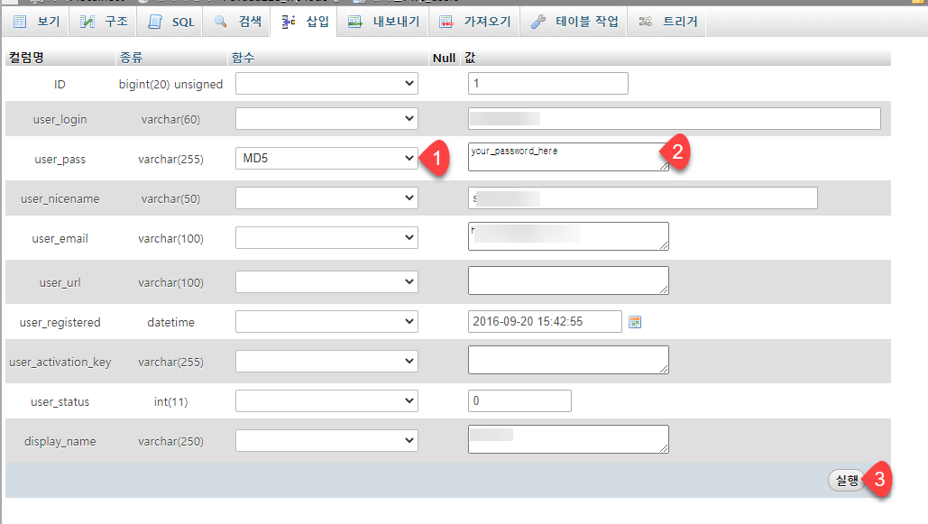 아래 동영상을 참고해보세요. 아래 동영상에서는 user_pass의 포맷을 MD5로 바꾸지 않고 하는 방법으로 설명되어 있습니다만, 기본적으로 동일합니다. 이 글에서 설명하는 MD5 포맷으로 바꾼 후에 직접 패스워드를 입력하는 방식이 조금 더 쉬울 것입니다.