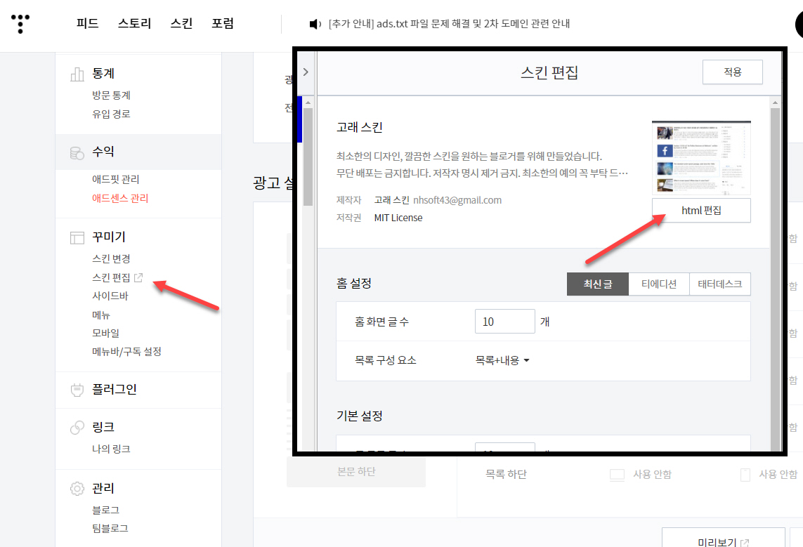 위와 같은 형식의 코드를 스킨의 HTML 파일 내의 적절한 위치에 추가하면 됩니다. 꾸미기 > 스킨 편집 > html 편집을 클릭합니다.