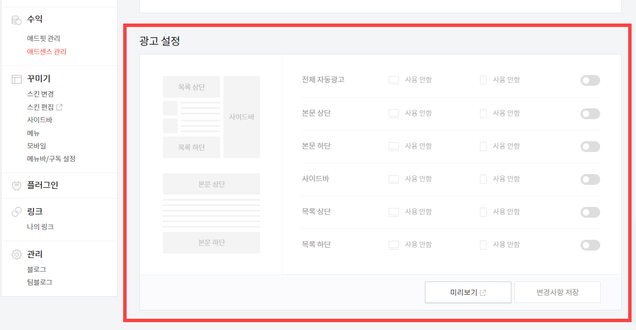 저는 구글 애드센스 계정은 연동하였지만, 광고 송출이 되지 않는 문제 때문에 광고 배치는 모두 비활성화하였습니다.