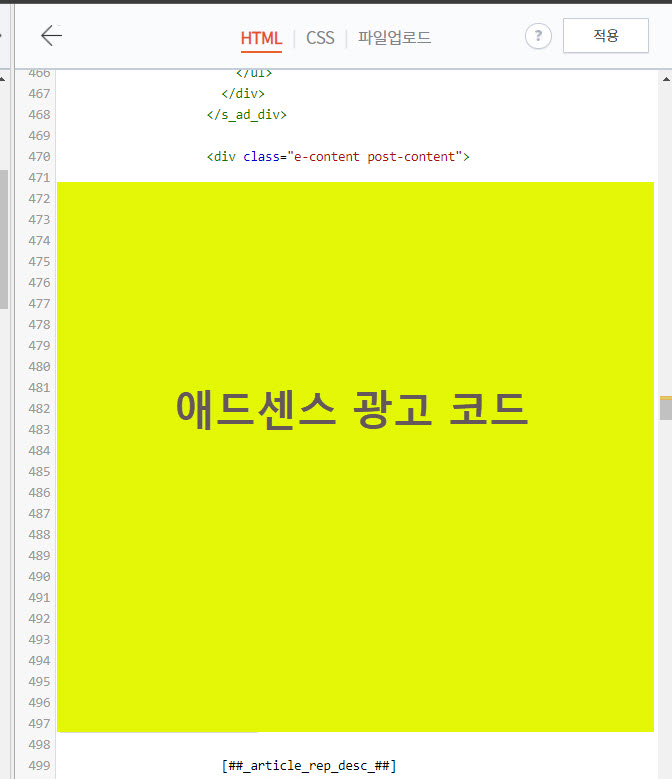바로 위에 애드센스 코드를 붙여넣기 했습니다. 이 부분이 여러 군데 있을 것입니다. 각 위치에 삽입하면서 광고가 송출되는지 확인하여 적절한 위치를 찾을 수 있을 것입니다.