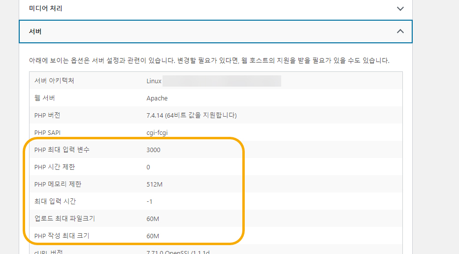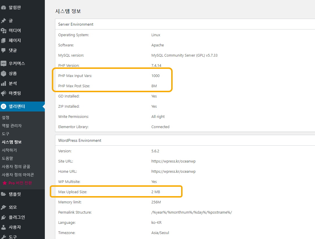 엘리멘터 > 시스템 정보를 확인해보니 몇 가지 서버 환경값이 대체적으로 서버에서 설정한 값보다 낮았습니다.