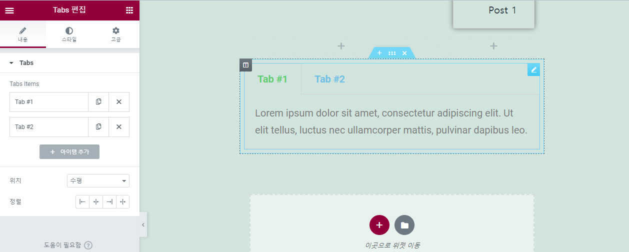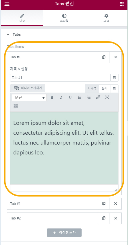 엘리멘터 페이지 빌더의 탭 요소