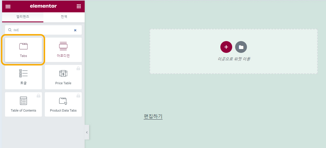 탭 요소를 추가하려면 엘리먼트 추가(요소 추가) 아이콘을 클릭한 다음,