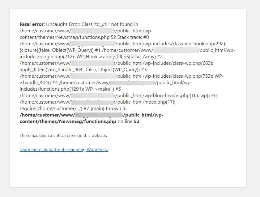뉴스맥 테마를 업데이트한 후에 "Fatal error: Uncaught Error: Class 'td_util' not found in /home/customer/www/xxxx/public_html/wp-content/themes/Newsmag/functions.ph:52 Stack trace: #0..."과 같은 에러 메시지가 발생하는 문제를 어제 맡았습니다.