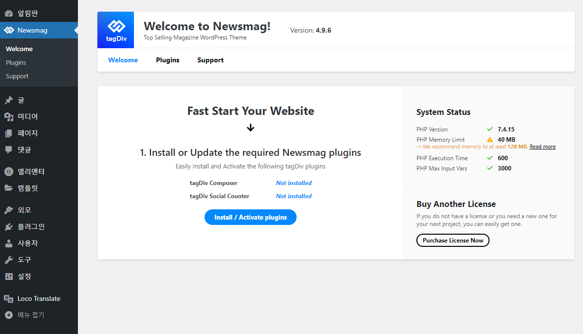 혹시나 싶어 Newsmag 테마를 다시 다운로드하여 설치해보아도 동일한 문제가 발생했습니다.