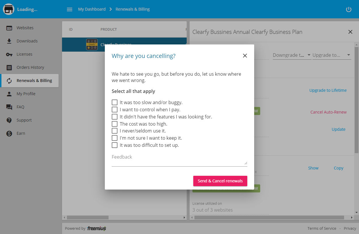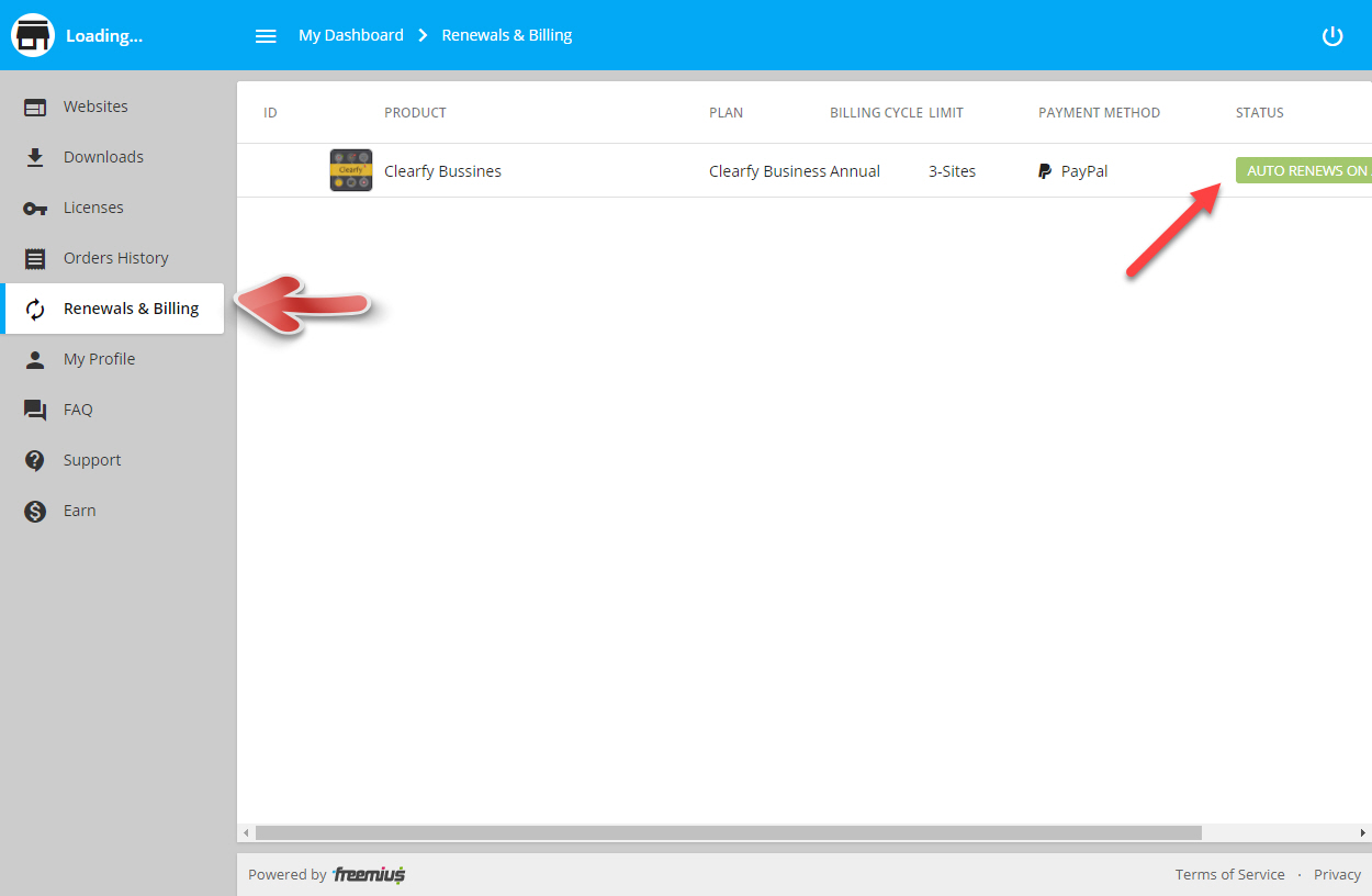 자동 갱신을 취소하려면 대시보드에 로그인한 다음 Renewals & Billing을 클릭합니다.