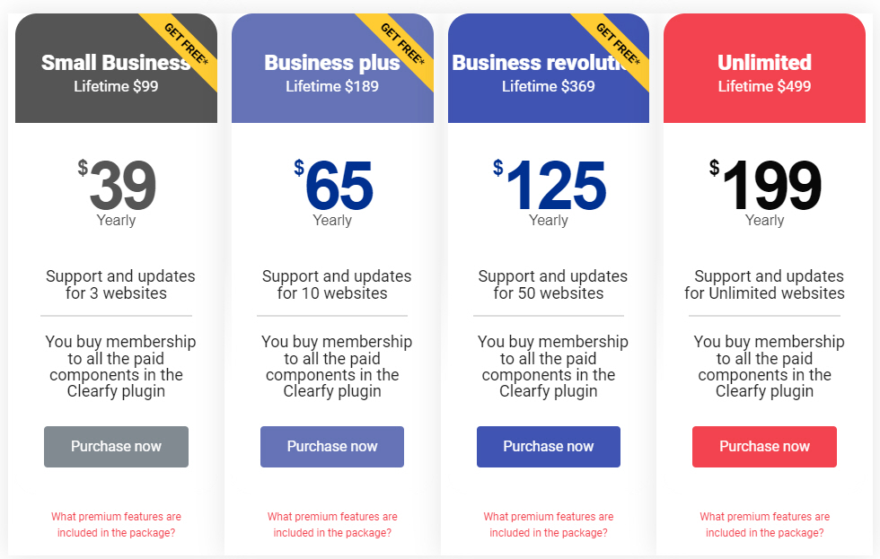 Clearfy 유료 버전에는 Small Business, Business plus, Business revolution, Unlimited 등 3가지 플랜이 있으며 각각 연간 라이선스와 평생 라이선스가 있습니다.