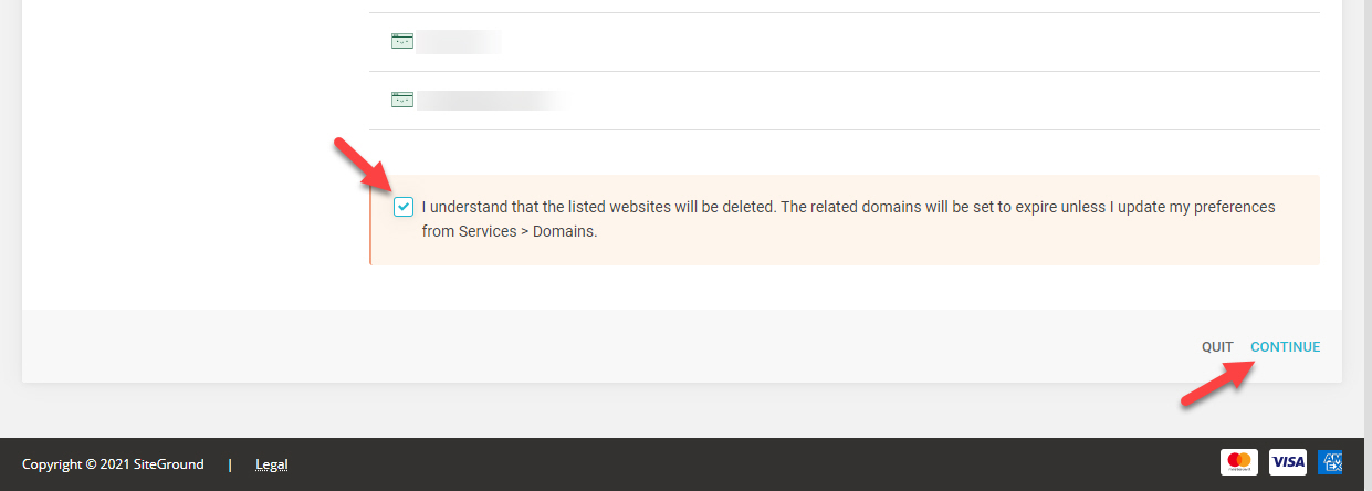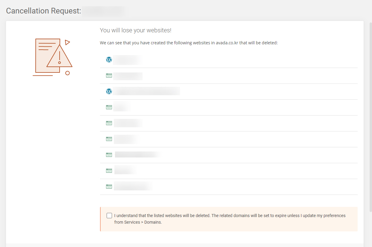 I understand that the listed websites will be deleted. The related domains will be set to expire unless I update my preference from Services > Domains 옆의 체크란을 선택합니다.