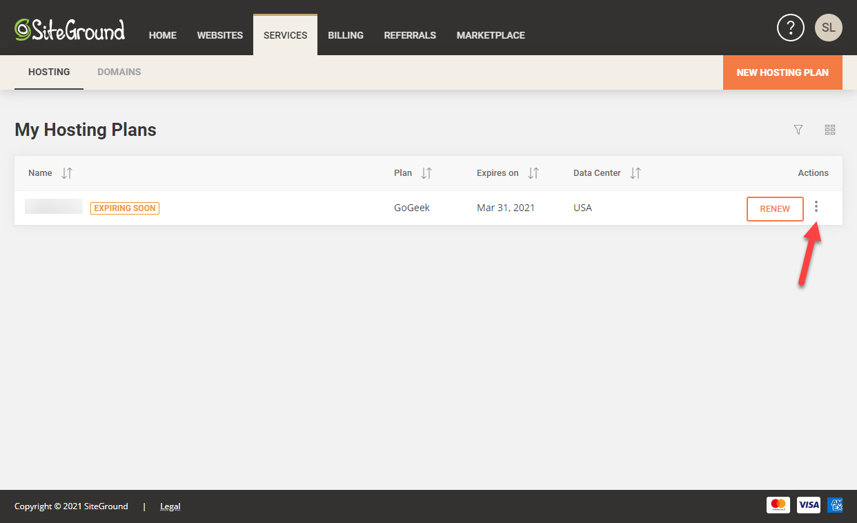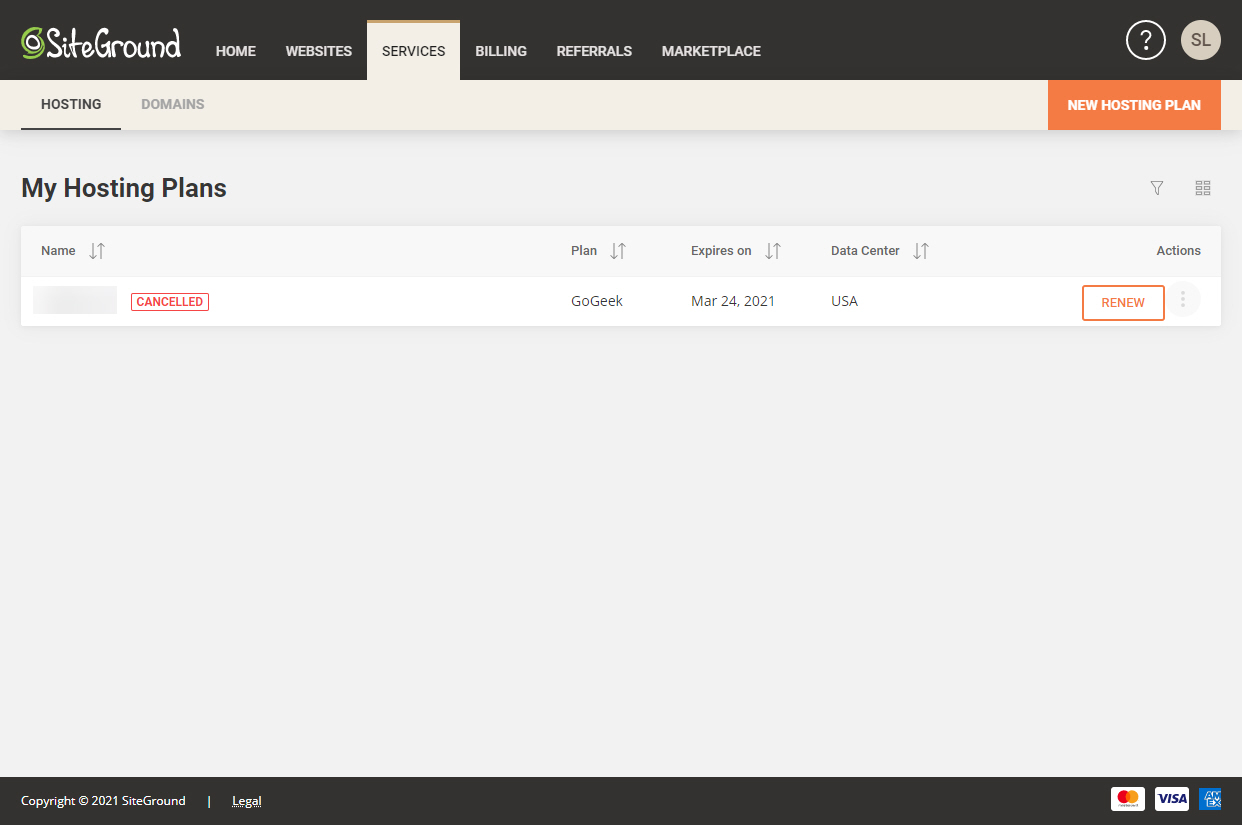 Services > Hosting 페이지를 방문하면 호스팅 플랜 상태가 Cancelled로 표시됩니다. 원하는 경우 만료 전에 Renew를 눌러 서비스를 갱신할 수 있습니다.