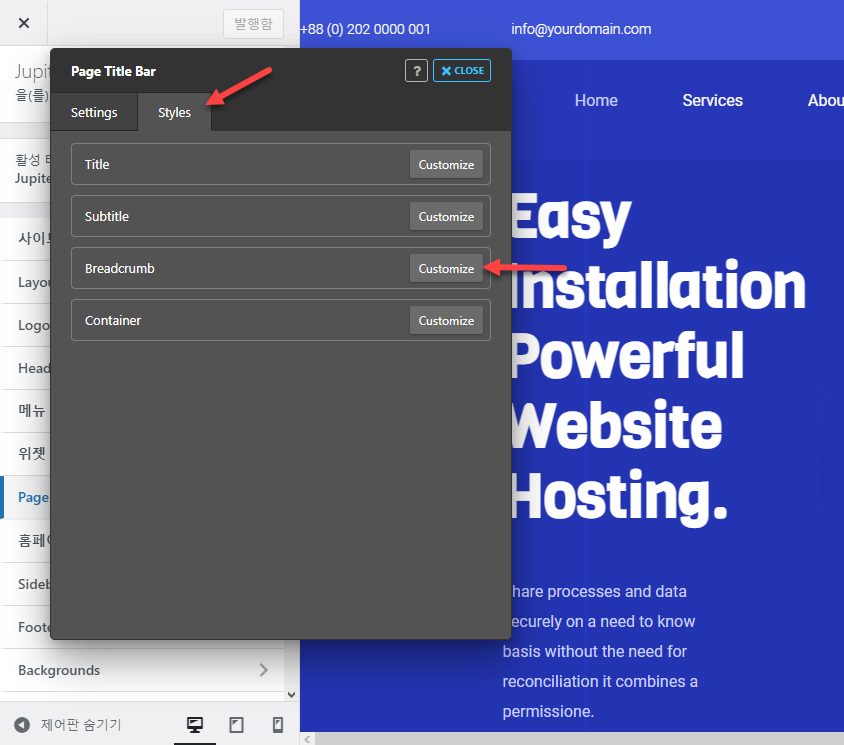Page Tible Bar 팝업이 표시되면 Styles 탭을 클릭하고 Breadcrumb 옆의 Customize (사용자 정의하기)를 클릭합니다.