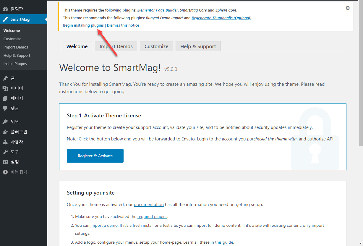 상단의 Begin Installing Plugins 링크를 클릭하여 테마 플러그인 설치 페이지로 이동합니다.