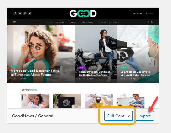 원하는 데모에서 Settings 드롭다운을 클릭하여 Settings Only와 Full Conent 중에서 원하는 임포트 옵션을 선택하고 Import 버튼을 클릭합니다.