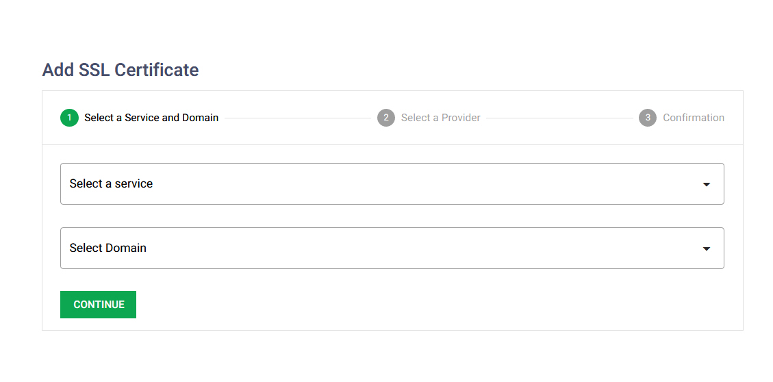 Select a service (서비스 선택)와 Select Domain (도메인 선택) 드롭다운을 클릭하여 SSL 인증서가 설치될 도메인을 선택합니다.