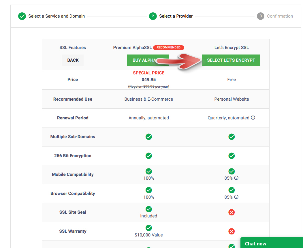 Continue를 클릭하면 설치할 인증서 종류를 선택할 수 있는 화면이 표시됩니다. Premium AlphaSSL과 같은 유료 인증서를 설치할 필요가 없으므로 Let's Encrypt SSL 아래의 Select Let's Encrypt를 클릭합니다.