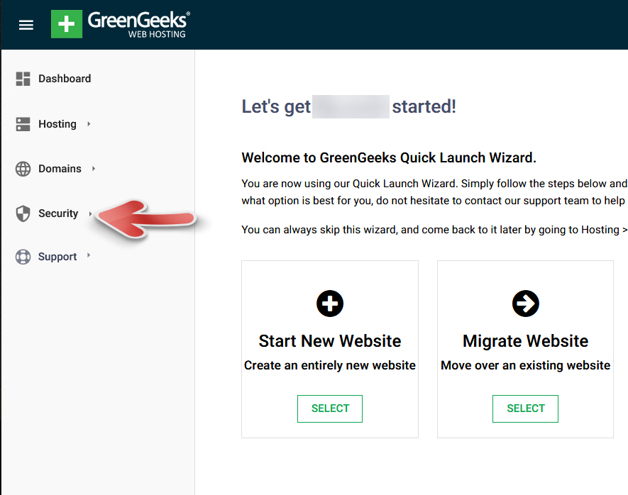 해외 웹호스팅 GreenGeeks에서 도메인에 보안서버 인증서를 설치하려면 GreenGeeks에 로그인한 후에 왼쪽의 Security (보안) 메뉴를 클릭합니다.