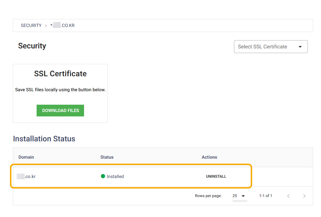 다음 화면에서 Install SSL Certificate (SSL 인증서 설치) 버튼을 클릭합니다.
