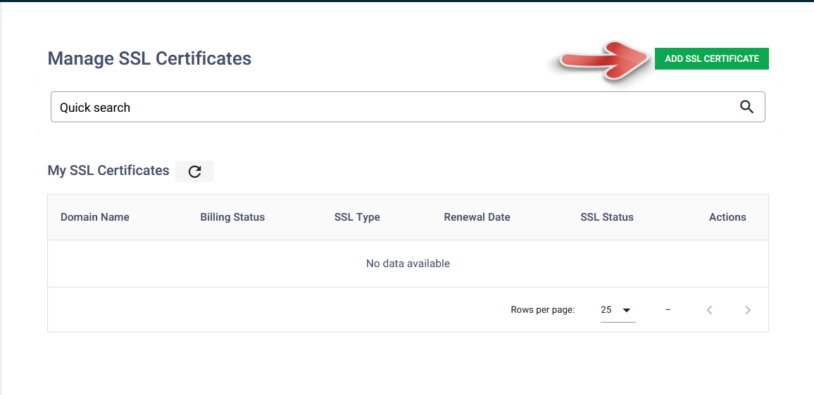 그러면 SSL 인증서 관리(Manage SSL Certificates) 페이지가 표시됩니다. Add SSL Certificate (SSL 인증서 추가) 버튼을 클릭합니다.