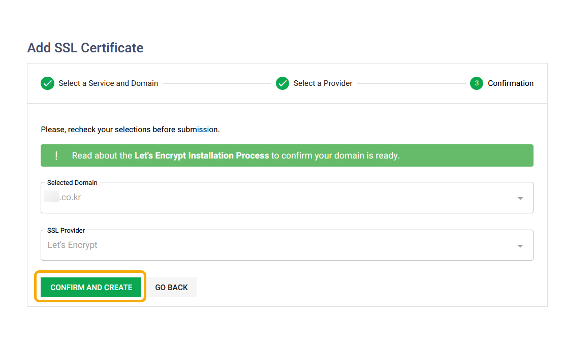 확인 화면이 나타나면 Confirm and Create (확인 및 생성) 버튼을 클릭합니다. 만약 Selected Domain (선택한 도메인)에 잘못된 도메인이 표시되는 경우 Go Back 버튼을 클릭하여 뒤로 되돌아가시기 바랍니다.