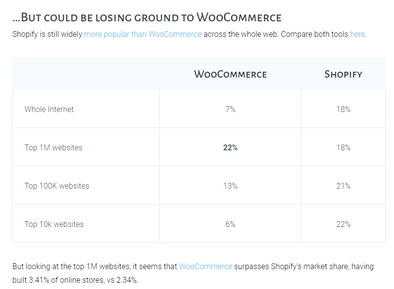 쇼피파이가 여전히 우커머스보다 인기가 있지만 상위 100만 개 사이트에서는 우커머스가 쇼피파이를 앞지르고 있습니다.