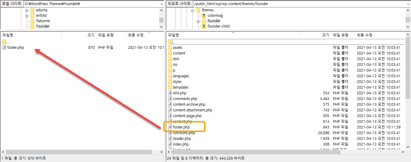 컴퓨터로 다운로드한 footer.php 파일을 차일드 테마 폴더(예:/wp-content/themes/founder-child)로 업로드합니다.
