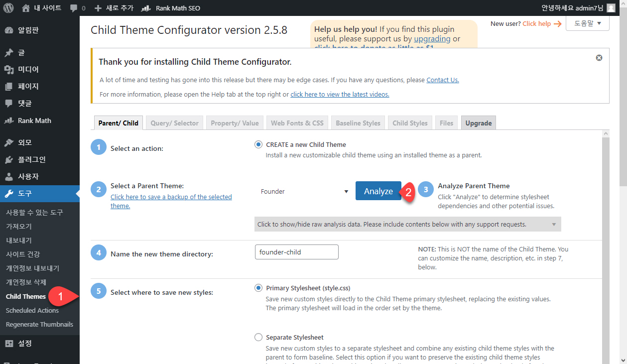 도구 > Child Themes로 이동하고 Select a Parent Theme에서 Founder를 선택한 후 Analyze를 클릭합니다. 그런 다음 차일드 테마를 생성하면 됩니다.