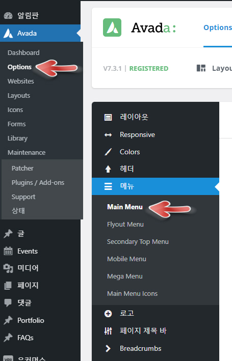 메뉴 크기나 메뉴 간격 등을 조정하고 싶은 경우 워드프레스 관리자 페이지 > Avada > Options > 메뉴 > Main Menu를 클릭합니다.