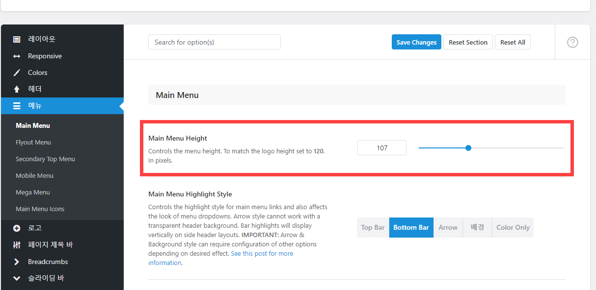 Main Menu Height (기본 메뉴 높이) 설정을 적절히 조정하도록 합니다.