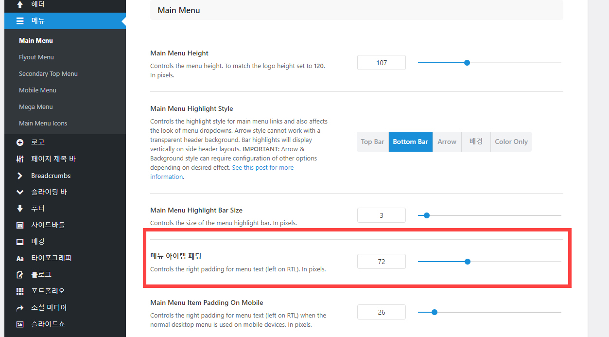 이 경우 메뉴 아이템 패딩 옵션 값을 조정하면 됩니다.