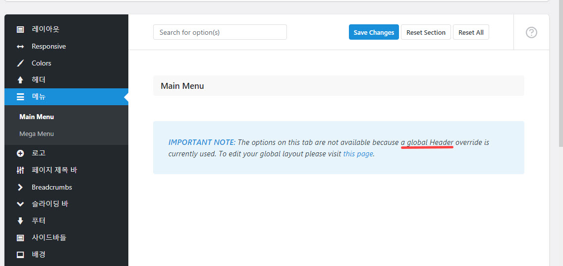 아바다 테마의 메뉴 관련 옵션은 보통 테마 옵션 내의 메뉴 페이지에서 조정이 가능합니다. 하지만 최근에 추가된 데모에서는 레이아웃 템플릿으로 제작되는 추세 같습니다. 이 경우 아래 그림과 같이 글로벌 헤더(Global Header)로 만들어졌기 때문에 해당 옵션을 사용할 수 없다는 메시지가 표시됩니다.