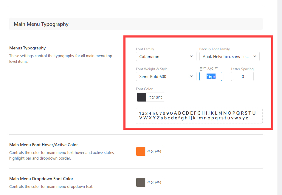 Main Menu Typography (메인 메뉴 타이포그래피) 섹션 아래의 Menus Typography 옵션에서 폰트 패밀리 (Font Family), 폰트 사이즈, 자간(Letter Spacing), 글꼴 색상 (Font Color) 등을 설정할 수 있습니다.
